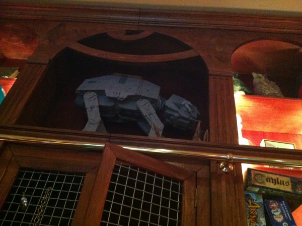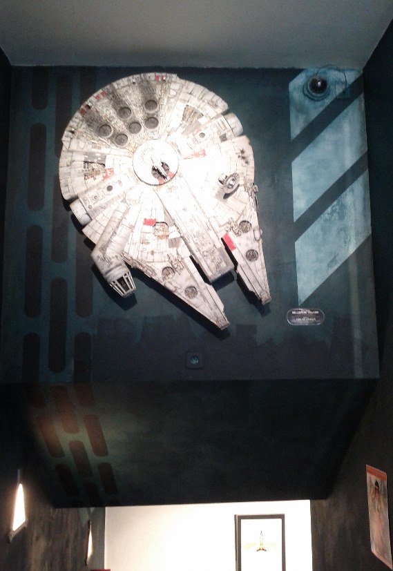 - Au rez de chaussée : bibliothèque et ludothèque cotoient le décor steampunk sobre et terriblement efficace. Et pour descendre à l’étage inférieur, le falcon annonce de suite le ton.