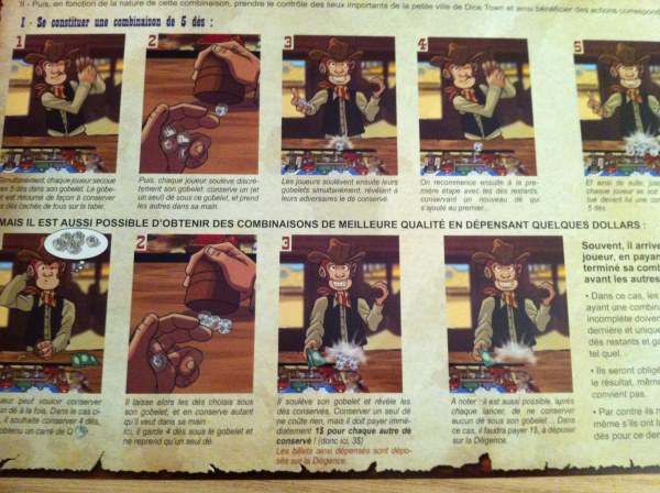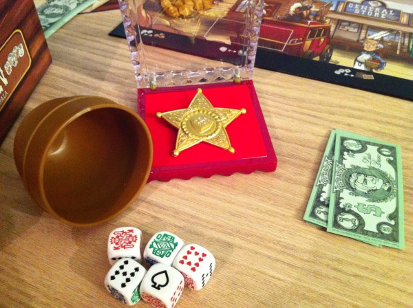 - lancé de dés : chaque joueur doit constituer une combinaison de dés de Poker qui permettra de contrôler la mine d’or, la banque, la mairie, le magasin ou le saloon … En premier lieu les joueurs lancent les 5 dés à l’aide du gobelet et n’en gardent qu’un qu’ils rendent visibles (sinon il paye le nombre de dés supplémentaires conservés), et ainsi de suite jusqu’à ne plus avoir de dés disponibles au lancé.
