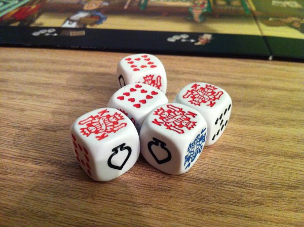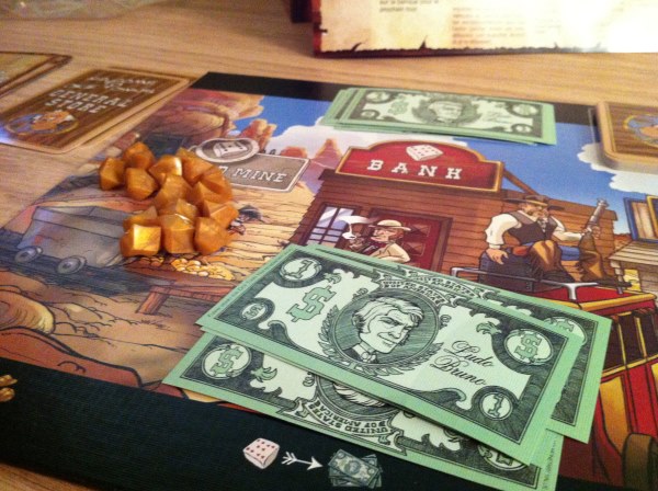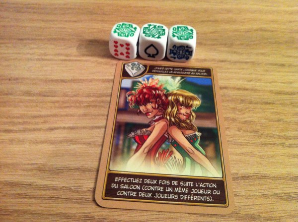 - résolution des actions : chaque joueur ayant le plus de tel ou tel symbole (9, 10, valet, dame, roi) se verra contrôler un lieu et en gagner les bénéfices. Mais pour obtenir des titres de propriétés (sans dépouiller les joueurs grâce au saloon) il faut avoir été le meilleur dans la combinaison de poker. En cas d’égalité le shérif devra trancher en fonction des chantages ! Ayez donc les bonnes grâces de votre shérif en lui donnant quelques pépites ou titres de propriété voire de l’argent 🙂 Et pour un joueur n’ayant obtenu aucun butin avec ses dés, il pourra quand même avoir un petit quelque chose suivant ses dés 🙂