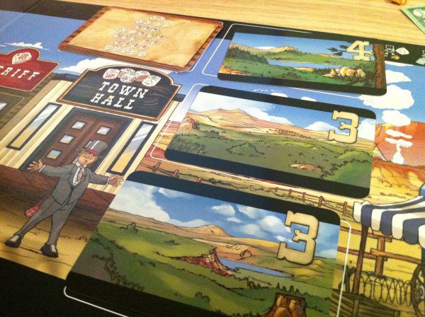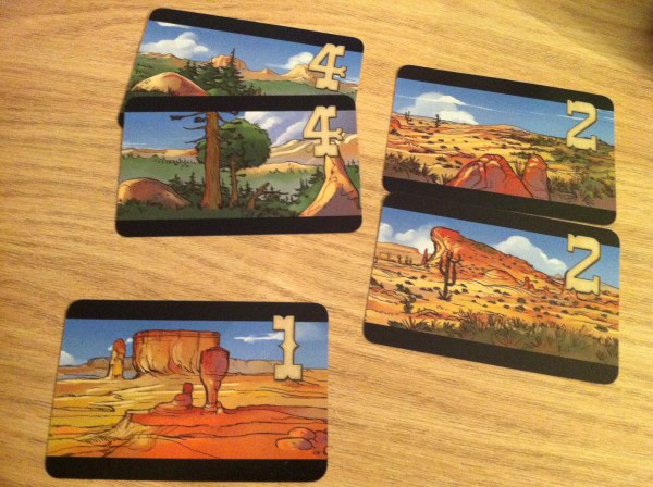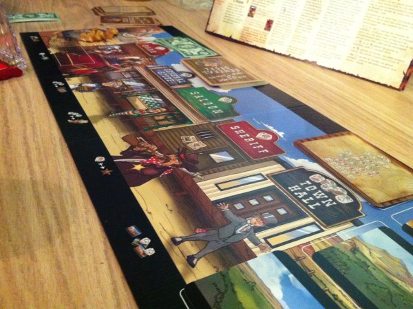 Nous avons joué à 2 notre première partie : j’ai gagné 73 à 51 grâce à l’étoile du shérif et les points de victoire des cartes du General Store (d’ailleurs ma moitié, qui ne savait pas que des PV étaient dispo dans le general store, ne dépouillait que mes cartes de propriété mais pas celles du general store).