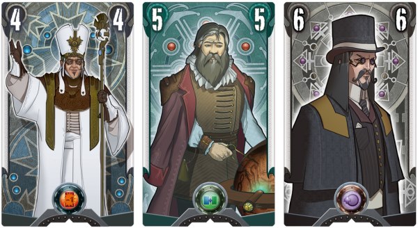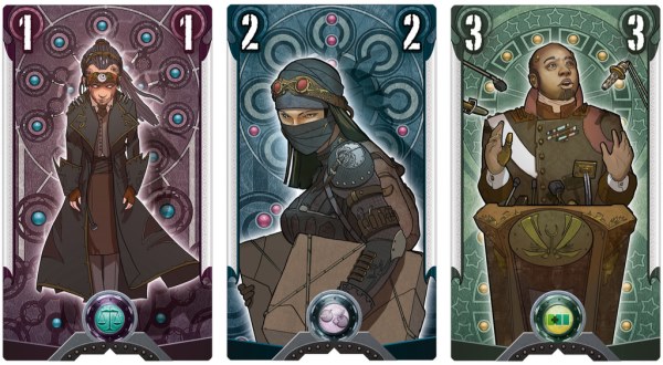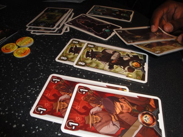 • Action : Chaque joueur dans l’ordre des aiguilles d’une montre et à commencer par le premier joueur va dévoiler ses cartes et jouer les pouvoirs ou les événements associés, à condition d’être majoritaire : si le premier joueur pose 2 cartes « banquier », il obtient 1 point de victoire (pouvoir du banquier) car il est majoritaire sur le banquier (personne n’a encore pu poser ses cartes). Si, par la suite, un autre joueur pose aussi 2 cartes « banquier », les deux joueurs n’obtiendront rien aux prochains tours car ils n’ont plus la majorité de banquier autour de la table. Ils sont donc à égalité jusqu’à ce qu’un des joueurs décide de voler la carte adverse, de jouer une troisième carte « banquier » ou bien de jouer la carte du personnage « omniscient » (1 seule dans le jeu) permettant d’être majoritaire en cas d’égalité.