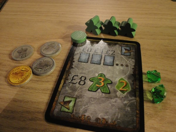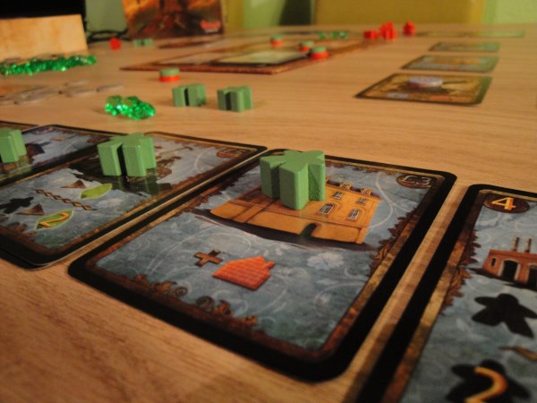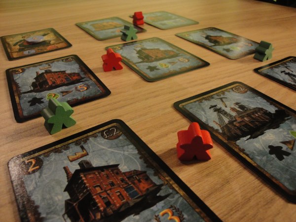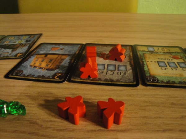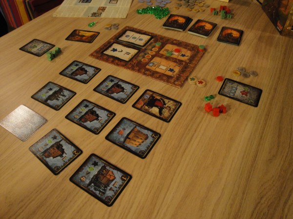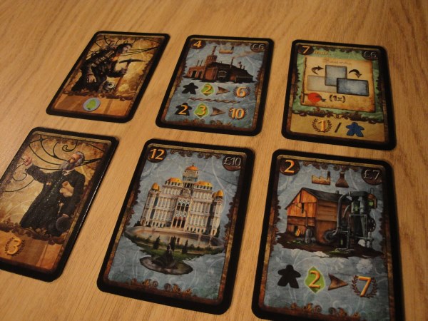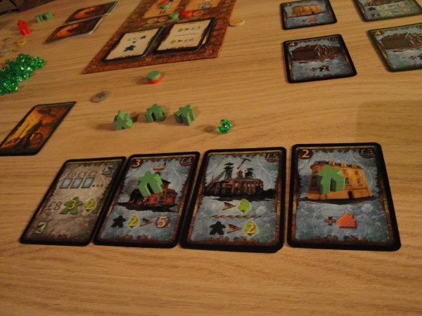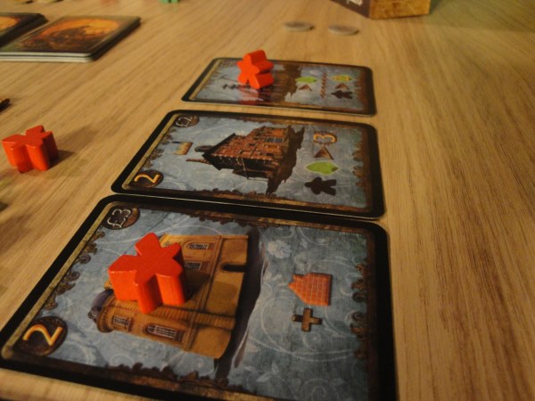 • 2ème phase : utiliser l’action de la carte Evènement (si non utilisée en phase 1), retirer un ouvrier d’entre 2 cartes pour l’acheter (bâtiment/brevet) ou l’activer (personnage), retirer un ouvrier pour récupérer quelques pièces (1 par meeple autour de la carte dont le vôtre). Ou bien utiliser un de ses ouvriers non posés pour activer un bâtiment qu’on a chez soi.