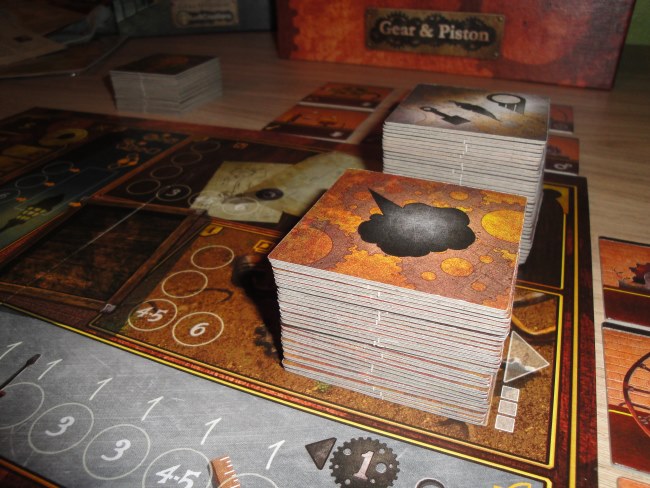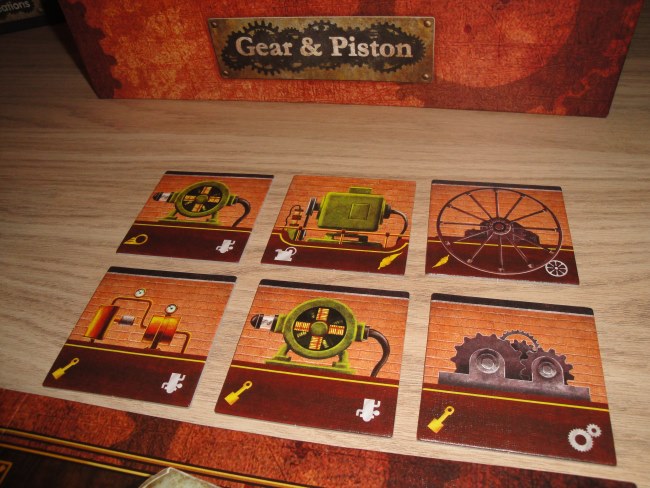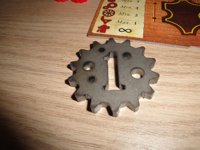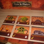 Mon premier pledge sur Kickstarter (plateforme de financement participatif) fut pour Gear & Piston. Le succès de la campagne (terminée le 21 mai dernier) a permis de débloquer une extension et un magnifique jeton « premier joueur » en métal et sous la forme d’un engrenage.