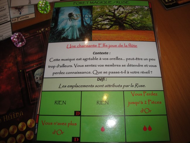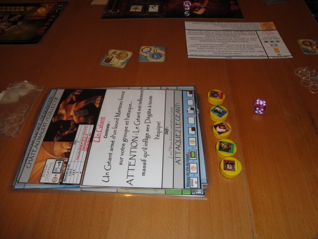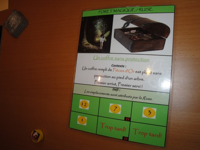 - Ruse : les joueurs dévoilent une tuile numérotée en même temps et celui ayant le chiffre le plus bas et étant le seul à l’avoir joué est nommé chef de groupe… il décidera de TOUT pour l’événement : ce que vous gagnerez ou perdrez lors de l’événement ou l’ordre dans lequel les joueurs vont se battre (sachant que celui qui porte le coup fatal au monstre rencontrés remporte la mise…). Les négociations vont bon train pendant cet événement : « une pièce d’or contre le gain, 10 PV pour être le dernier à me battre… »