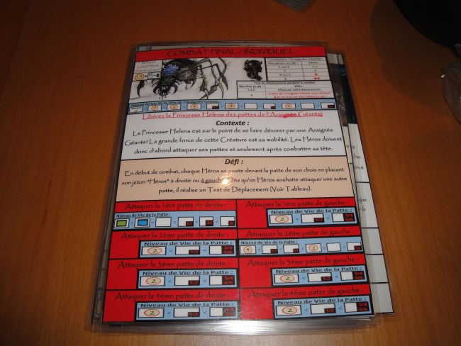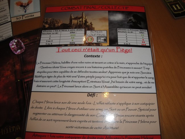 Heureusement il ne m’écoutera pas car je ne m’y connais absolument pas. Moi j’aime pousser du cube et poser des meeples, et me voilà embarquée pour un château maudit gardé par un monstre duquel on devra sauver la princesse Héléna. Remarque ! Ca me rappelle de bons souvenirs : mes longues soirées donjons dans World Of Warcraft… ah non ? non.