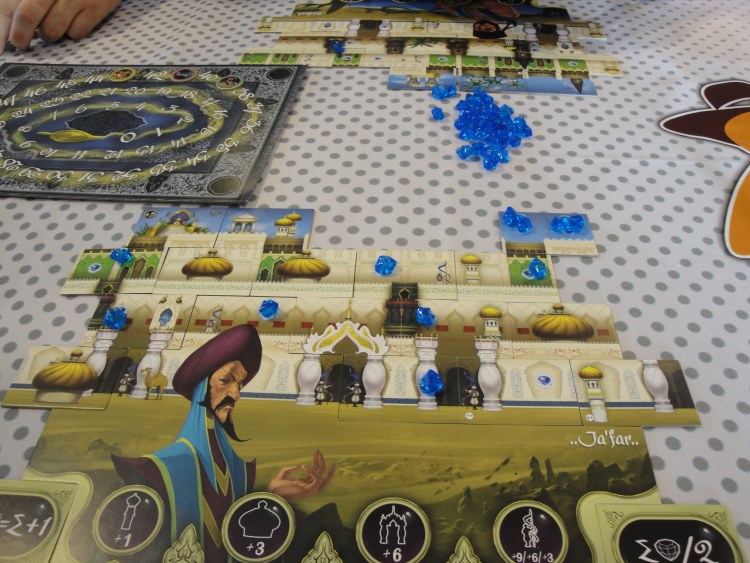 Le décompte de points se fait par les caractéristiques de votre personnage et les éléments de votre construction. Certains vont marquer des points sur les tourelles alors que d’autres vont se battre pour les minarets. Vous allez être tranquilles pour les tuiles « palmiers » alors que vous allez devoir user de malice voir de génie pour récupérer les ornements de portes… on commence à voir ici, l’utilité des génies pour jouer deux fois, aller chercher la tuile qu’il vous faut, la choix de dévoiler une deux ou trois tuiles : j’ai un plus grand choix, mais j’en offre plus aux autres également… et donc voici le coté taquin glissé dans ce jeu par M. Chevallier. Se rajoute à ça, les deux tuiles « objectifs secrets » qui en plus de donner les bornes de votre palais, permettent de rajouter des points sans que les adversaires le soupçonne…
