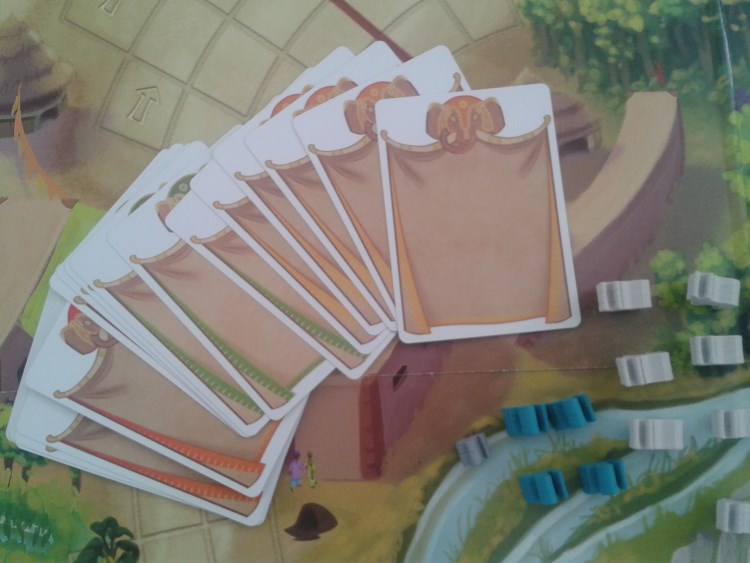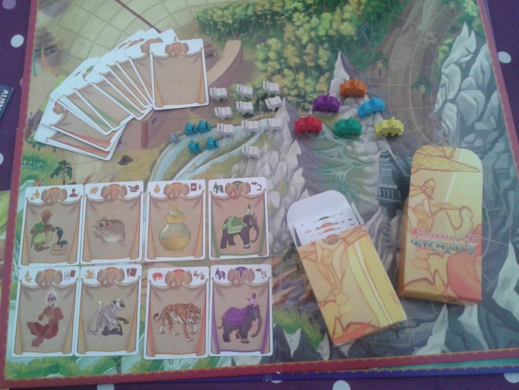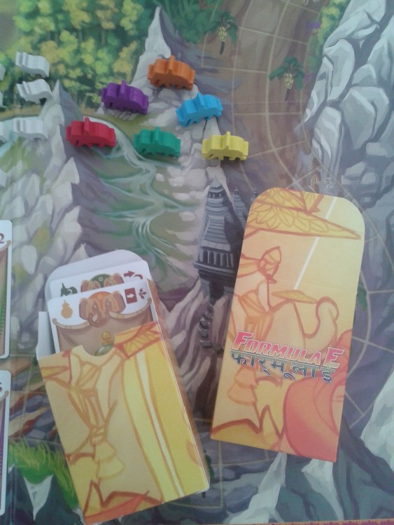Après tout, qu’importe le montant du financement final, l’important étant bel et bien que le jeu existe. D’ailleurs, la 1ère bonne surprise qui est réservée au joueur ouvrant sa boite de Formula E est la qualité de l’édition. Le grand plateau de jeu représentant le parcours de la course est très lisible (un recto pour 3 ou 4 joueurs et un verso pour 5 ou 6 joueurs). A cela s’ajoutent des cartes très jolies permettant de déplacer son éléphant ou d’activer des effets. Il faut d’ailleurs vraiment insister sur le travail d’illustration exemplaire de Jacqui Devis qui, en plus d’offrir un coup de crayon séduisant, a su cerner l’esprit même du jeu : c’est beau sans être trop sérieux. Enfin, les meeples d’éléphants, de serpents, de vaches sacrées ou de la souris font vraiment « vivre » la course. D’ailleurs, pour ranger les cartes et les meeples, l’éditeur a même pensé insérer deux petites boites permettant au matériel de ne pas s’éparpiller une fois le jeu rangé.