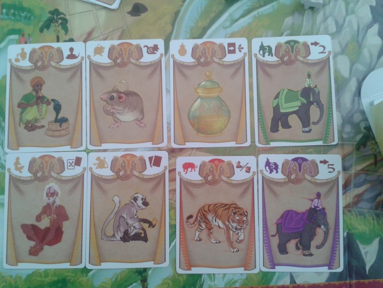 Les déplacements sont symbolisés par une carte illustrée d’un éléphant et d’un numéro indiquant le nombre de cases pouvant être ainsi parcourues. Cependant, un pachyderme n’étant pas une voiture de course, sa mobilité est limitée. Ainsi, tant que cela est possible, votre éléphant ira tout droit (sans se poser de questions !). Visiblement, cet animal n’est pas très doué pour les slalomes. D’ailleurs, il n’est pas rare que cela se termine en bousculade générale et qu’un éléphant arrivant à toute allure pousse son congénère placé devant lui. Ce n’est que lorsqu’il est n’a plus d’autres choix que l’animal pourra changer de voie.