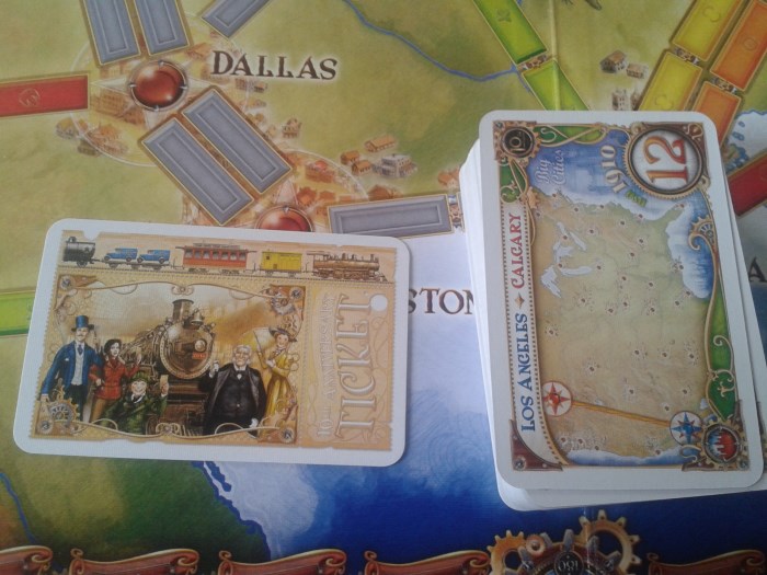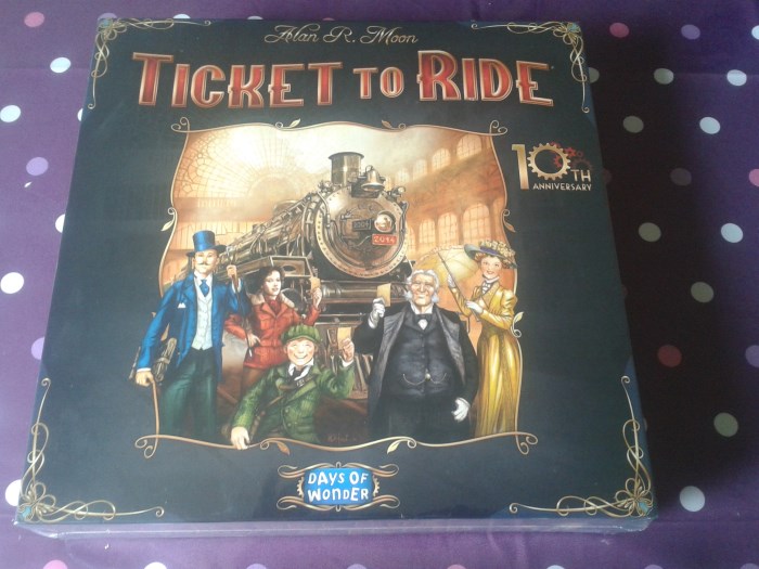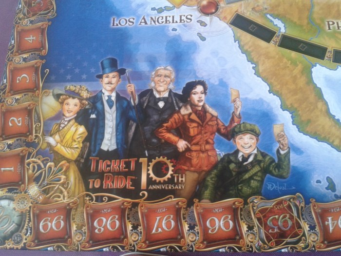 C’était il y a 10 ans (Déjà!), j’ouvrai innocemment pour la 1ère fois la boite d’un jeu qui deviendrai l’un des classiques incontournables des années 2000 : Les Aventuriers du Rail (USA) ! Superbement illustrée, la boite attirait naturellement l’œil dans les rayons des boutiques spécialisées. D’autant qu’à l’époque (tiens, j’ai l’impression d’être Grand Père quand j’utilise cette expression 😉 ), les jeux avec d’aussi beaux atours étaient rares : Plateau de très bonne taille, lisible et magnifiquement dessiné par Julien Delval. A cela s’ajoutaient des jolis petits wagons en plastique monochromes très stables. Seuls les plus maniques pouvaient éventuellement pester contre la petite taille des cartes. Mais bon, il fallait vraiment avoir envie de râler devant un matériel aussi beau…d’autant plus que ce point avait été corrigé assez rapidement dans les éditions suivantes. Bref, l’édition initiale des Aventuriers du Rail était déjà un véritable bonheur pour la rétine… mais qu’en est-il de cette version 10ème anniversaire ?