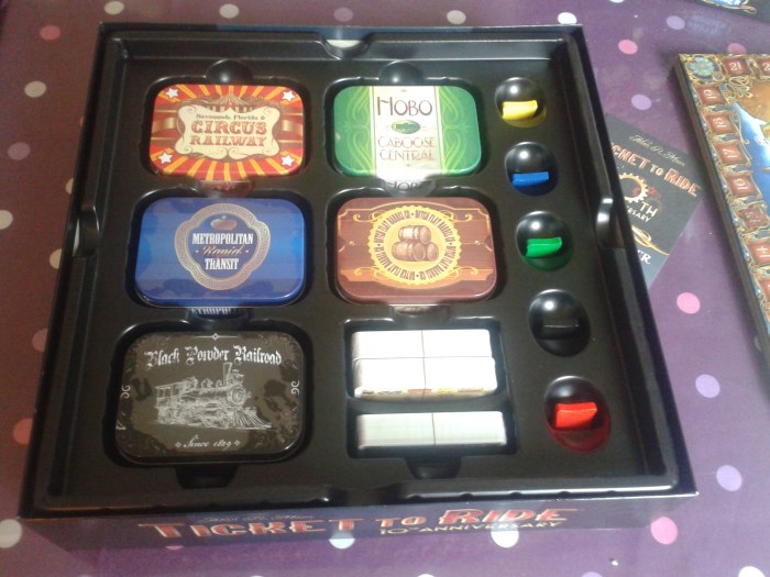Alors que renferme cette fameuse édition 10th ANNIVERSARY des Aventuriers du Rails ? Comment le Best Seller vendu par millions d’exemplaires de Days Of Wonder peut-il être encore plus beau ? Et bien déjà, comme vous pouvez le voir sur les photos, l’éditeur a mis les petits plats dans les (très !) grands. A commencer par la boite et le plateau de jeu. Tout deux ont vraiment gagné en taille par rapport aux éditions « classiques » déjà parues. De plus, la boite sur fond noir donne un côté « so british » à l’ensemble qui n’est pas pour me déplaire. Le superbe (très grand) plateau, à l’opposé, brille de mille feux avec des couleurs chaudes qui donnent le sourire.