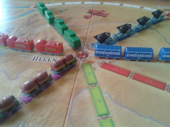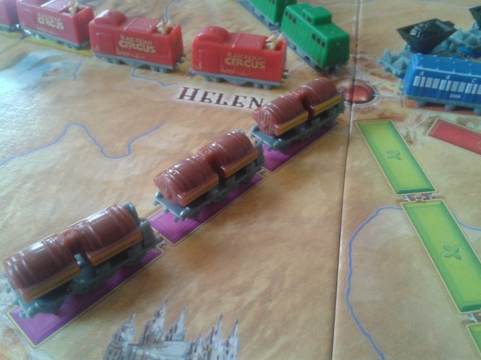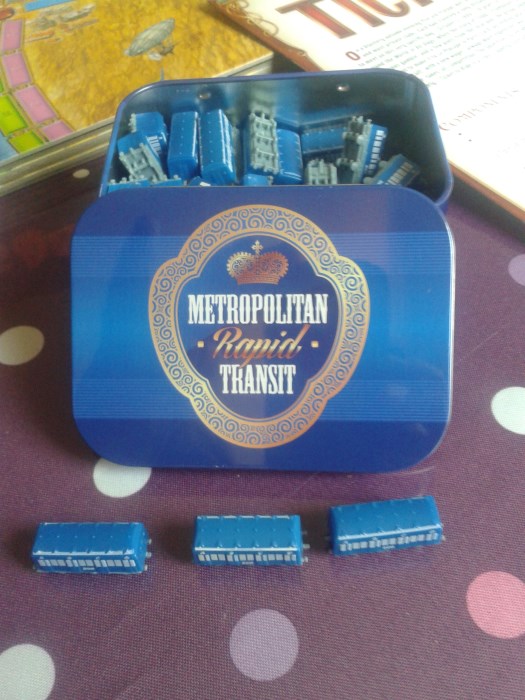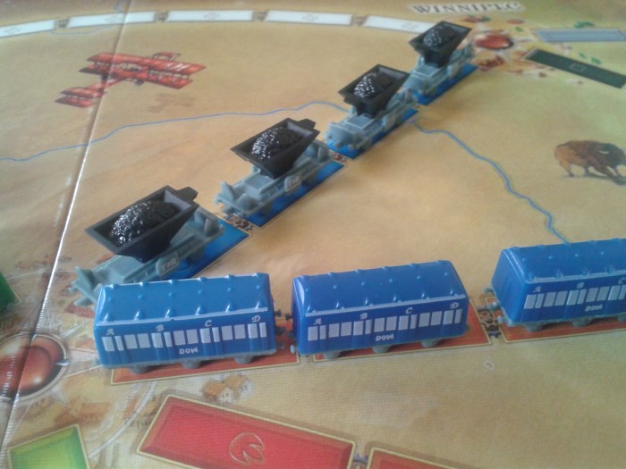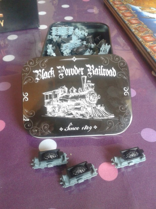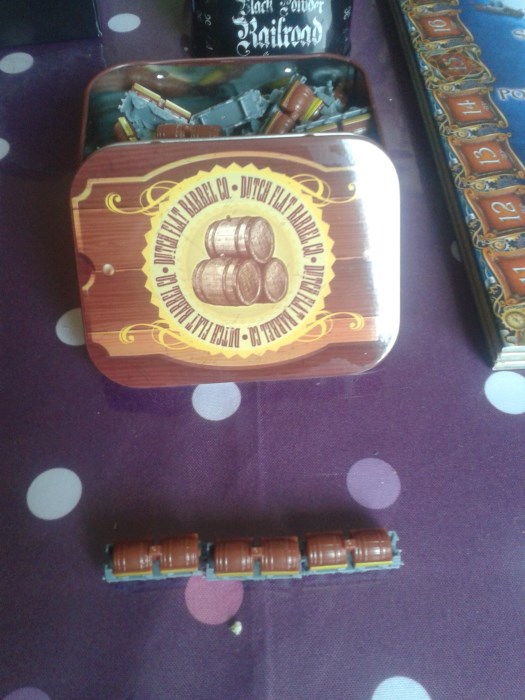 Mais ce n’est pas tout, non contents de nous offrir un plateau aussi beau que lisible, les p’tits gars de DOW ont eu l’idée aussi inutile qu’indispensable de mettre les p’tits wagons dans des boites à bonbons métalliques. L’effet est immédiat. On s’attendrait presque à trouver des Quality Street à l’intérieur… mais à la place il y a (presque !) mieux : des wagons en plastique extrêmement stables et surtout personnalisés : Par exemple, les wagons de la Black Poinder Railroad transportent du charbon et ceux du Circus Railway promènent des girafes, etc. Une fois en place sur le plateau, l’ensemble apparaît encore plus agréable à l’œil que le jeu original. De plus, les illustrations des cartes ont été habilement revues et amènent avec elles ce vent de fraîcheur ! 🙂