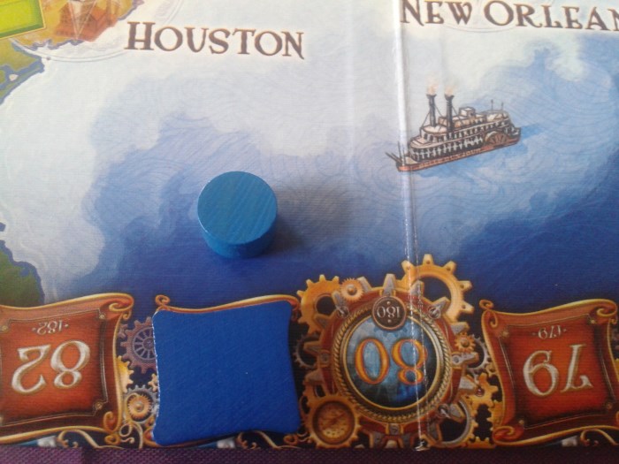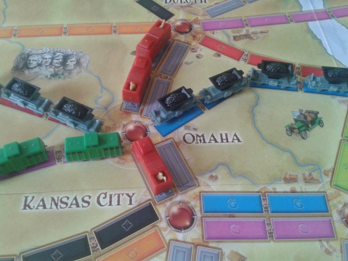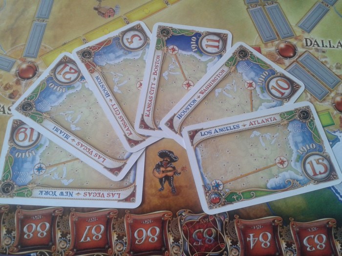 Parlons explications. C’est bien beau (c’est le cas de le dire ! 😉 ) mais comment fonctionne ce jeu ? Et bien c’est extrêmement simple : Dans les Aventuriers du Rail, vous allez diriger une compagnie ferroviaire chargée de relier différentes villes des Etats Unis. En début de partie, chacun prend 3 cartes « objectifs secrets » représentant des villes à relier avec leurs wagons. Plus les villes sont éloignées, plus elles rapporteront des points de victoire en fin de partie. A son tour de jeu, un joueur a le choix entre une seule des actions suivantes :