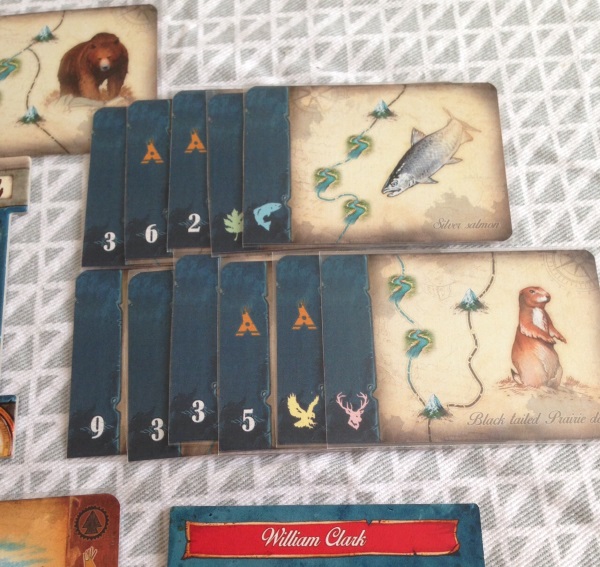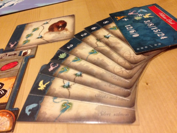 Comment marquez-vous des points ? À la fin du jeu, vous cumulez vos points bruts sur vos cartes, puis vous ajouter vos points de découvertes (séries de différents éléments : mammifères, volatiles, poissons ou plantes) et enfin une majorité attribue des points supplémentaires aux joueurs ayant le plus dialoguer avec les indiens (le plus grand nombre de tepees accumulés).