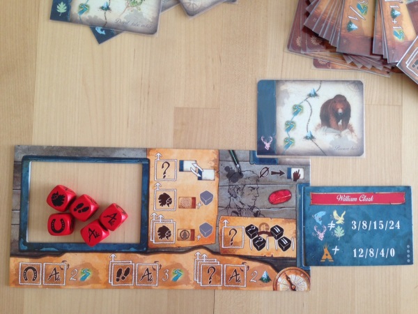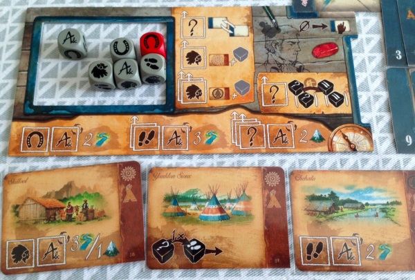 Votre plateau de jeu vous permet de stocker vos dés, d’effectuer un grand nombre d’action en plaçant vos dés, et de constituer votre manuscrit grâce aux cartes explorations déjà réalisées. Ces actions vous permettent de changer votre exploration en cours par une des trois présentes sur le plateau central, de parlementer avec les indiens (3 au centre également), de modifier vos dés (très, très, très important), et d’effectuer une progression en rivière ou en montagne.