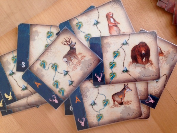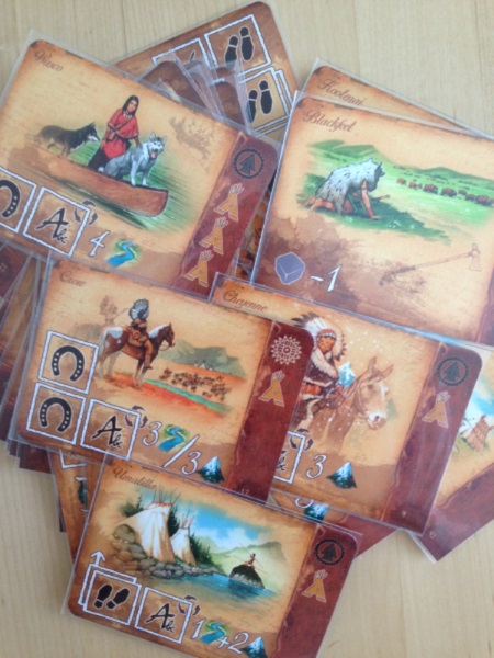 Le nombre de cartes sera adapté selon le nombre de joueurs déterminant la durée de la partie. Les cartes sont recto-verso : le recto est la face exploration avec différents éléments (type de terrains, points de prestige, animaux – plantes – volatiles ou poissons rencontrés, parfois une tribu indienne) ; le verso représente les indiens de différentes tribus avec lesquels vous allez pouvoir échanger (ils peuvent être facilement accessibles ou au contraire méfiants. Cela influencera l’effort nécessaire à les convaincre de vous aider dans votre expédition).