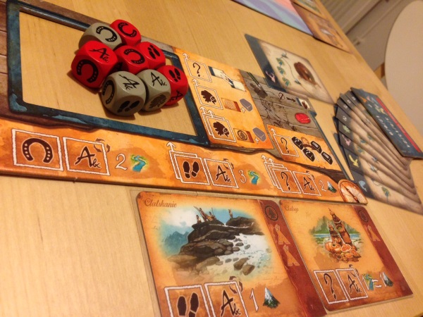 Les actions explorations sont simples à comprendre : vous effectuez d’abord la marche à pied ou à cheval, et vous posez les dés écriture (dés primordiaux) à la fin pour valider votre expédition et passer à la suivante. Les cartes « faciles » rapportent peu de points de victoires et s’effectuent rapidement tandis que les cartes qui rapportent le plus nécessitent plus de préparation. Merci Captain Obvious. Mais cela est important pour les coups doubles. Si votre préparation vous permet d’enchainer votre carte en cours, puis d’effectuer une des trois cartes présentes sur le plateau central, non seulement vous faites un gros coup en réalisant deux cartes, mais en plus vous rejouez derrière. Super important pour un jeu où le timing est non négligeable.