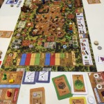 Futur Kickstarter je crois, ce jeu propose aux joueurs d’explorer un monde et d’y travailler pour y batir vos églises (si j’ai bien tout compris). A votre tour vous pouvez faire 2 types d’actions : explorer, marcher, travailler, chasser, développer (construire)….. Malheureusement le plateau non lisible, l’aide de jeu pas super bien foutue et l’évolution des objets mal indiquée ne nous a pas permis d’apprécier le jeu. On espère beaucoup plus venant d’un jeu de ce type : originalité et expérience.