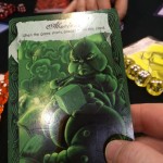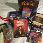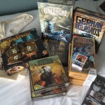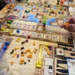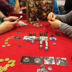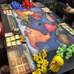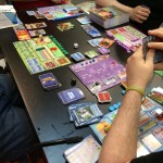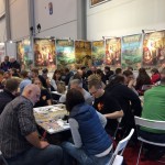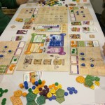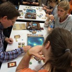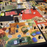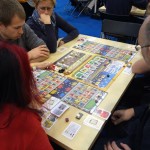 Arrivée le jeudi vers 11h50 (cause Thalys, ils doivent certainement avoir été formés par la SNCF…), j’ai foncé sur les stands que j’avais noté pour mes premières emplettes et , un seul stand mal indiqué et ce fut 3h de marche à chercher l’extension de Roll for the galaxy nommée Ambition. Puis je croise au détour d’une allée Raphael (éditeur Igiari) avec une boite du précieux ! Son ami a pu m’indiquer le bon chemin et surtout le bon stand, au fin fond du Hall 7 dernier stand, minuscule, avec des boites cachées ! Après un aller / retour pour l’hôtel (histoire de me débarrasser des sacs trop lourds), je retrouve Merlin et Muir du Mesnil de la campagne de Cholet [ :p ] pour quelques parties :