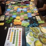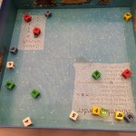 J’avais pledgé sur ce petit jeu de placement et déplacement de grenouilles et je n’avais jamais eu l’occasion d’y jouer mais la table étant libre et les hommes jouant à un autre jeu à côté, on décide de se faire expliquer les règles et d’y jouer avec un asiatique (qu’on aurait pas du inviter car il a fait de sacrés coups). Bullfrogs est un jeu de majorité dans lequel on remporte des points de victoires quand un nenuphar est rempli de grenouilles. Je n’expliquerai pas les règles non plus mais c’est clairement efficace et on peut même décider du temps de partie.