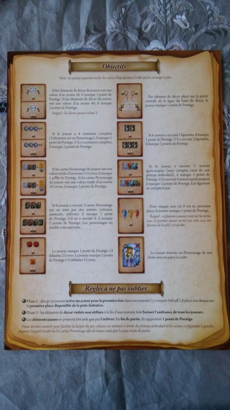 - Ambiance : En fonction de l’évolution de l’ambiance dans les différents théâtres, les joueurs remporteront des bonus ou des malus. De plus, lors des tours 4 et 6, les acteurs devront répéter en costume ce qui engendrera un décompte de points supplémentaire.