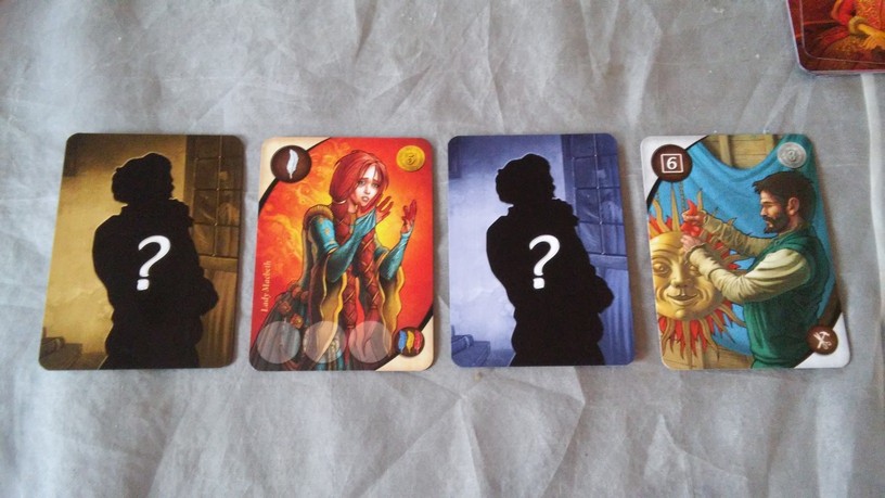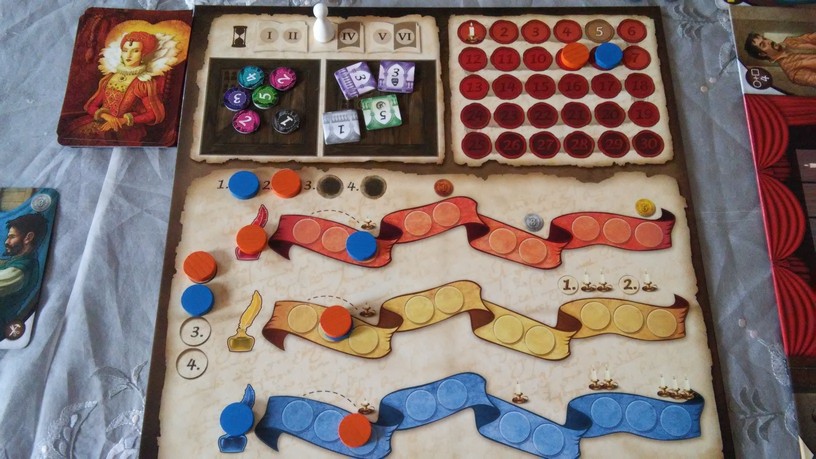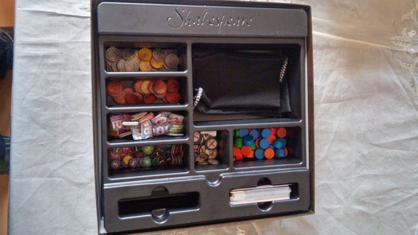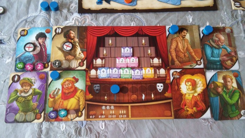 Shakespeare est composé d’un très beau matériel. Celui-ci donne vraiment envie de jouer, d’autant plus qu’il est particulièrement bien illustré : A. Demaegd et Nériac, les illustrateurs du jeu, ont eu la très bonne idée de mettre en commun leur talent respectif pour offrir un visuel de 1er ordre. Ce travail est d’ailleurs très bien expliqué dans un petit livret bonus offert aux 1ers acheteurs du jeu. C’est notamment sur les cartes artisans et acteurs que les illustrations explosent nos mirettes : Juliette ou Béatrice n’ont jamais été aussi belles ! C’est principalement sur ce point que le thème ressortira durant la partie. En plus de ces très jolis cartes, le boite renferme divers pions en bois (jeu de gestion oblige !), quatre plateaux individuels solides et plateau principal. Les tuiles de décors et les jetons de couture sont placés chacun dans un sac dédié. Globalement, le travail d’édition est vraiment à souligner.