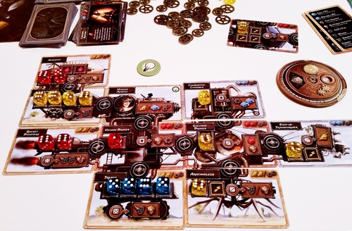 J’ai failli craquer lors du Kickstarter et j’ai immédiatement regretté. D’ailleurs je ne sais pas ce qui m’a freinée : j’aime les dés, le steampunk, les illustrations, la mécanique. Je dois parfois avoir des absences… Bref, il se joue jusqu’à 8 et ça peut intéresser les collègues. Je n’ai plus aucune raison de douter ! Concernant la mécanique : draft (choix de carte ou de dés miamm), modification des dés (pas encore bien compris), et course !!! objectif : passer la ligne d’arrivée le premier (pas le dernier hein). Je pense que c’est simple et efficace pour le midi au bureau mais pas que… Et en plus, il y a un thermoformage (juste histoire de faire râler quelques twittos).