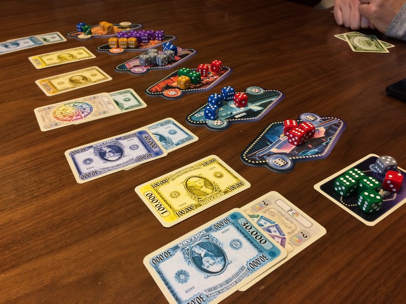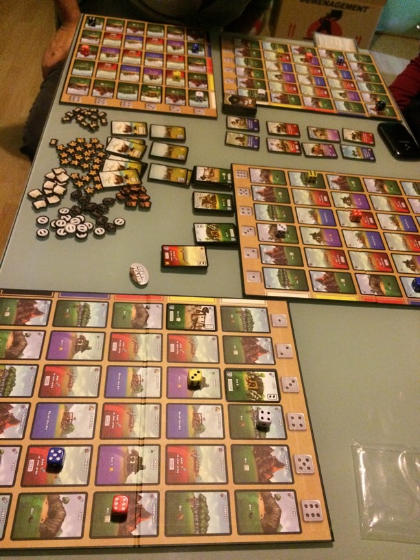 Le Nid a enfin mis la main dessus !!! Les collègues allaient beaucoup aimé donc il ne fallait pas le rater. Et pour le coup, ils ont bien accroché, notre première partie a été très mouvementée entre jet de dés pourris et placement de dés bien mesquins. On a très vite sortis les mini variantes (table 7, billets cachés, gros dés…). L’extension renforce et enrichit le jeu.