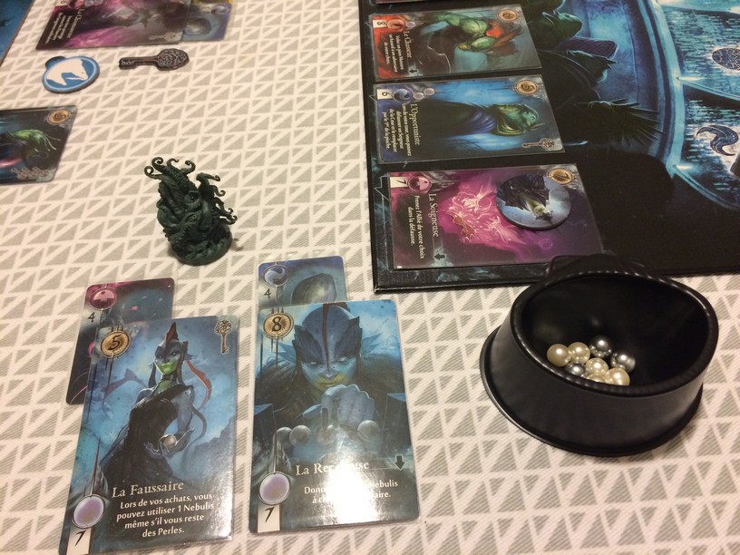 Bref, Abyss, que dire qui n’ait pas déjà été abordé ? C’est le jeu 2014 du blog (élu non pas que pour sa beauté mais par ses nombreuses possibilités et interactions). Il était donc déjà parfait et pourtant… l’extension amène un nouveau peuple, de nouveaux lieux (avec un mini jeu de stop ou encore) et………. les nébulis (des perles noires qu’on récupère contre des alliés multi colors et qu’il ne faudra pas garder en fin de partie sous peine de subir 5 points négatifs). On se refile les perles oui mais les noires on ne souhaite pas trop en recevoir haha. L’extension amène donc encore plus d’ambiance et n’alourdit pas du tout le jeu. Comme pour Five Tribes, je ne me vois plus jouer sans l’extension.