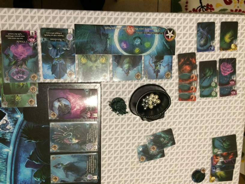 Jeu d’enchères puis placement de cartes gagnées avec beaucoup de manières de scorer, il faut donc rester concentrer et trouver un duo ou trio de scores à « farmer ». Je pensais avoir fait un mauvais jeu puis qq cartes sont tombées à pic, 55 points (mais le vainqueur a fait 64 !!!! on l’a trop laissée réfléchir 😉 ). La phase d’enchères est la seule phase avec de l’interaction malgré qq poses de cartes qui volent des tokens à d’autres. J’ai beaucoup aimé cette première partie à renouveler pour un avis plus ferme.