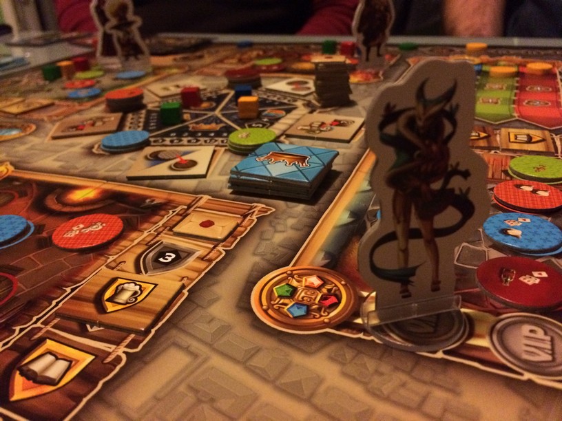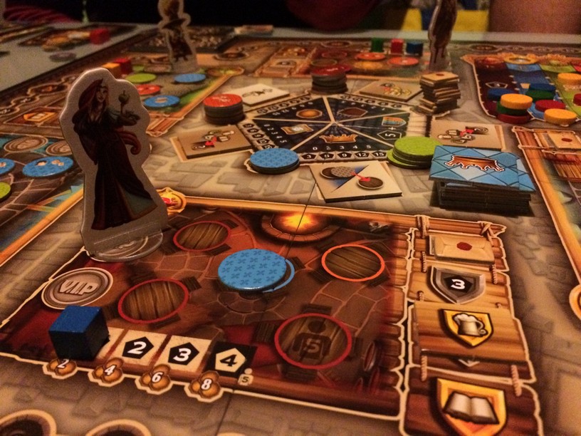 C’est en soirée presque froide qu’on a décidé de sortir Taverna à 4 (2 joueurs connaissaient déjà). J’avais apprécié la TT TV, j’aime les GAG et puis les dessous de verre et le sac étaient une excellente idée de goodies ! Mais revenons au jeu. Dans Taverna, vous placez des clients à des tables dans les tavernes que vous possédez en commun ou non. Selon le type de client, le type de table où vous le placerez et ce qu’il veut, vous allez jouer sur différents tableaux et faire monter votre score mais comme si ça suffisait pas, vous pourrez, en plus, utiliser un notable qui est dans la taverne au moment où vous placerez vos clients. Il y a donc plein de combos et de choses à faire, mais vous n’avez que 6 tours, 6 minuscules tours pour espérer remporter la victoire! et croyez moi c’est serré ! Malgré les cartes clients aléatoire, c’est un excellent jeu, une excellente idée, un jeu tendu avec un goût de reviens y assez important. Bref, que faites vous encore là ? foncez le chercher !!!