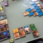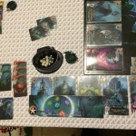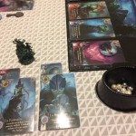 Jeu d’enchères puis placement de cartes gagnées avec beaucoup de manières de scorer, il faut donc rester concentrer et trouver un duo ou trio de scores à « farmer ». Je pensais avoir fait un mauvais jeu puis qq cartes sont tombées à pic, 55 points (mais le vainqueur a fait 64 !!!! on l’a trop laissée réfléchir 😉 ). La phase d’enchères est la seule phase avec de l’interaction malgré qq poses de cartes qui volent des tokens à d’autres. J’ai beaucoup aimé cette première partie à renouveler pour un avis plus ferme.
