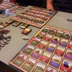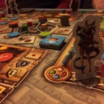 C’est en soirée presque froide qu’on a décidé de sortir Taverna à 4 (2 joueurs connaissaient déjà). J’avais apprécié la TT TV, j’aime les GAG et puis les dessous de verre et le sac étaient une excellente idée de goodies ! Mais revenons au jeu. Dans Taverna, vous placez des clients à des tables dans les tavernes que vous possédez en commun ou non. Selon le type de client, le type de table où vous le placerez et ce qu’il veut, vous allez jouer sur différents tableaux et faire monter votre score mais comme si ça suffisait pas, vous pourrez, en plus, utiliser un notable qui est dans la taverne au moment où vous placerez vos clients. Il y a donc plein de combos et de choses à faire, mais vous n’avez que 6 tours, 6 minuscules tours pour espérer remporter la victoire! et croyez moi c’est serré ! Malgré les cartes clients aléatoire, c’est un excellent jeu, une excellente idée, un jeu tendu avec un goût de reviens y assez important. Bref, que faites vous encore là ? foncez le chercher !!!