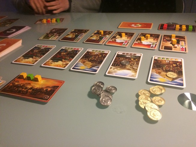 - Acheter/réclamer une carte pour la prendre dans votre main => plus elle se trouve à droite, plus elle vous coûtera ; la première sur la ligne sera gratuite, la seconde coûtera un épice (que vous poserez sur la carte précédente), la troisième coûtera 2 épices (que vous poserez sur les 2 cartes précédentes…) etc… et oui il est possible que la carte visée ait déjà des épices déposés par un autre joueur, et bien ils sont à vous si vous achetez la carte. A chaque fois qu’une carte est prise, on décale les cartes vers la gauche et on en pose une nouvelle pour le joueur d’après.
