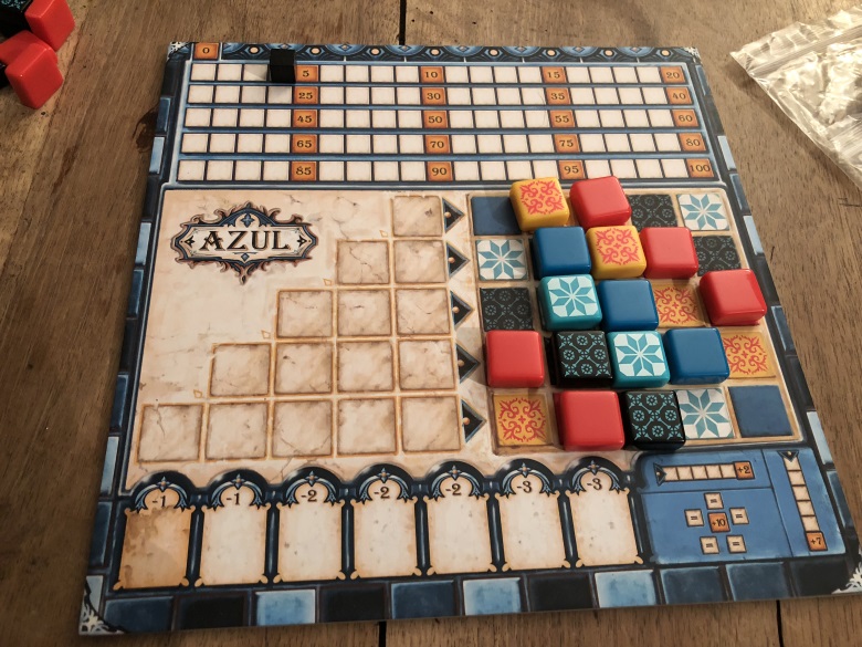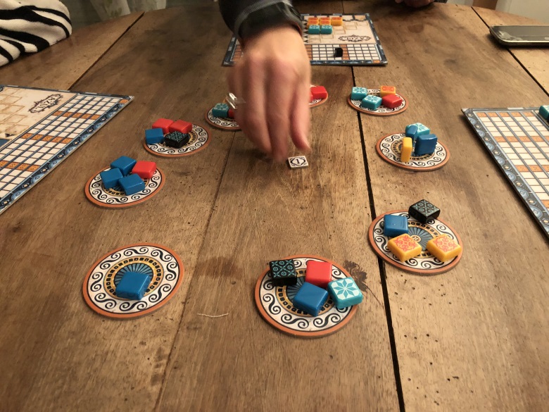 On y a joué le premier soir (je crois ou le second? je m’y perds dans les soirées…). J’ai été complètement sous le charme visuel et mécanique de ce jeu. Tout est parfaitement placé dans la mécanique, rien ne dépasse, rien n’est trop ça ou pas assez ceci. Il tourne aussi bien qu’un moteur de T MAX. Bref, Azul c’est Sagrada pour gamer. Déjà j’aime Sagrada, je ne pouvais donc qu’être conquise. Donc Azul ? Rapidement, la mécanique consiste, à votre tour, à choisir une face de tuile, à récupérer toutes ces tuiles sur un marché ou bien sur la défausse et à placer ces tuiles sur la même ligne de votre plateau. Une fois que les tuiles ont toutes été récupérées on fait glisser une tuile par ligne complète sur notre mur, on marque des points selon les tuiles adjacentes. J’abrège volontairement, les règles sont disponibles en français sur BGG je vous invite à les télécharger si vous ne connaissez pas.