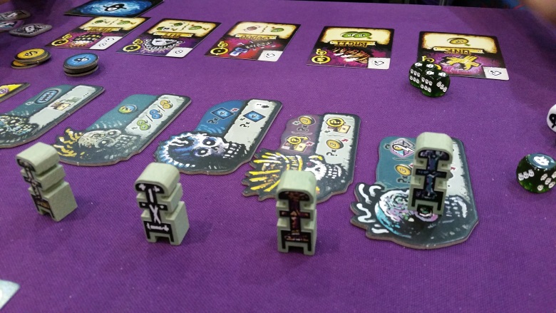 Fanny n’a pas aimé et moi j’ai bien accroché, j’aime les jeux de dés en fait (comme si c’était une surprise). J’ai apprécié la rapidité de la partie, les combo de cartes sorts, l’effet du dé rouge (pour annuler un dé adverse), l’interaction sur l’invocation des ancêtres (qui donne aussi des actions à l’adversaire). Bref, bon petit jeu, pas cher, aux graphismes décalés.