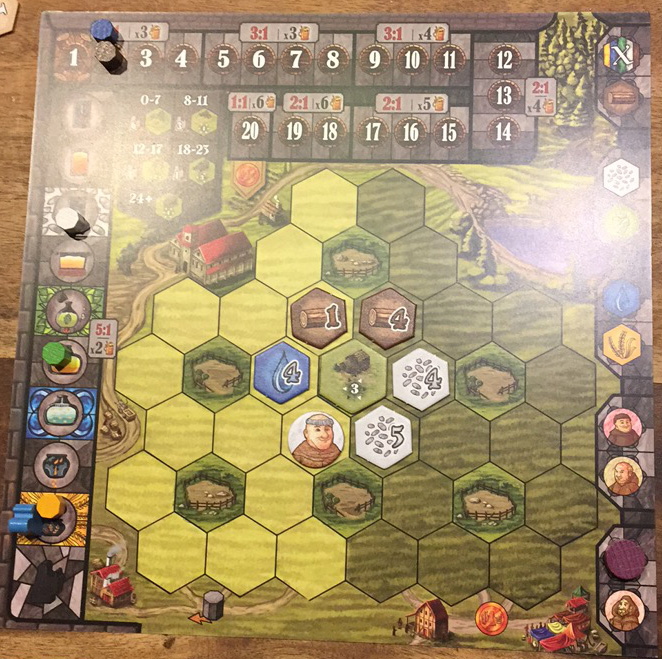 Sur celui-ci, sur le pourtour, se trouvent les différentes ressources du jeu (eau, bois, Houblon, Orge et Levure), les moines, les cases qui permettent de réaliser des objectifs, ainsi que des cases d’activation de bonus.