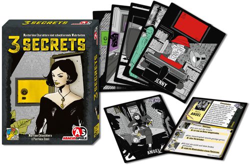 Il s’agit d’un jeu de Martino Chiacchiera et Pierluca Zizzi de 2 à beaucoup de joueurs pour des parties de 10 minutes. La petite boite de « 3 Secrets » renferme 52 grandes cartes représentant au verso une illustration avec des personnages dans un lieu donné avec 3 éléments en couleur et tout le reste en noir et blanc.