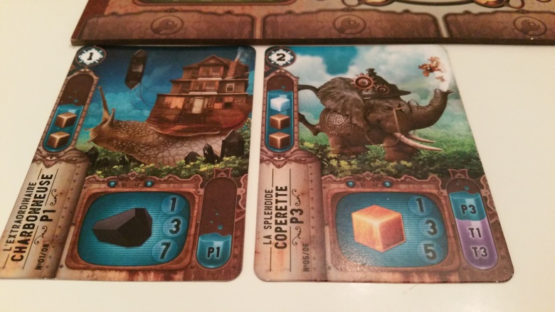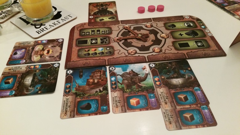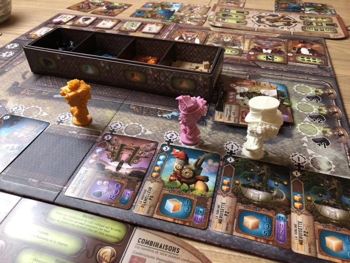 Mais revenons donc au matériel. Le moins que l’on puisse dire c’est que Bombyx a mis le paquet sur le look Steampunk onirique. Tout y est ! Les machines toutes plus extravagantes les unes que les autres, les personnages lookés aux noms alambiqués et des animaux anthropomorphes (dont certains me mettent assez mal à l’aise je dois l’avouer). Sans parler de la dentition en plein milieu du plateau !!!