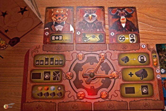 - faire 2 actions au choix grâce au plateau joueur (recruter un assistance qui se gratte le nez mais vous apportera quelques variantes ENORMES à votre jeu, réparer une machine, gagner du charbonium, aller au marché faire des échanges, démonter une machine (cassée ou réparée), réorganiser son atelier)