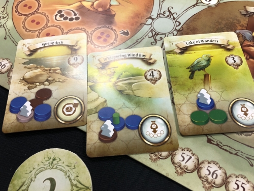 - grâce aux fragments récoltés vous pourrez faire des actions pour construire les paysages demandés par les cartes objectifs (soit vous gardez les fragments soit vous pouvez les défausser contre 1 action : par exemple, avec le fragment vert on peut faire pousser un arbre)
