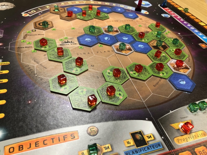 J’avais envie d’un gros jeu et tout le monde parlait de Terraforming Mars. Patrice me l’a donc fait découvrir. Je m’attendais à un jeu de cartes. Ce fut le cas. J’ai passé un superbe moment, pourtant moi et les cartes ça a toujours été compliqué. Mais il y a de la gestion, de la « conquête » de Mars, des pouvoirs à activer etc… Je l’ai trouvé parfait ce jeu. Par contre, plus j’y pense et moins j’ai envie d’y rejouer. Je le trouve très long pour ce qu’il propose en fait. Les qualités sont là mais je suis mitigée. Le draft des cartes est vu et revu. Ceci dit, j’ai particulièrement aimé la progression dans le jeu et dans l’habitabilité de Mars : les animaux qui arrivent quand l’oxygène atteint un certain niveau etc… J’ai trouvé le thème vraiment sympa mais la mécanique me laisse sur ma faim même s’il y a de très bonnes idées. Les goûts et les couleurs… En tous les cas, j’y aurai joué au moins une fois et le matos de Broken Token est juste énorme !