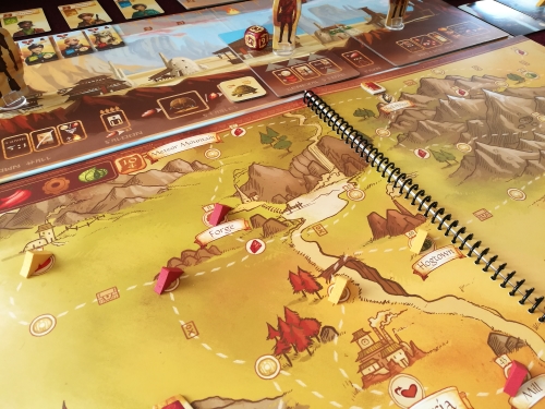 Near and Far est la suite d’un des hits de monsieur Laukat, Above and Below (malheureusement pas encore localisé en français), et est, comme ce dernier, un jeu que je qualifierai de semi-narratif. En effet, dans Near and Far, vous allez incarner un aventurier, qui partira à travers le monde en quête des « Dernières Ruines ». Vous allez pour cela, à chaque partie, ouvrir l’Atlas sur l’une des cartes magnifiquement illustrée, et poser au dessus de celle-ci le plateau principal représentant le Village. Car Near and Far est un jeu hybride. Il ne s’agit pas « seulement » d’un jeu d’exploration narratif teinté de jeu de rôle, mais aussi d’un jeu aux mécaniques se rapprochant de la gestion (légère, certes). Durant votre partie, vous allez donc à la fois explorer la carte, mais aussi devoir accumuler diverses ressources afin d’acheter des objets (des artefacts), engager des bêtes de sommes, engager des aventuriers dans votre compagnie, etc … Afin d’avoir le plus de points à la fin d’une partie.