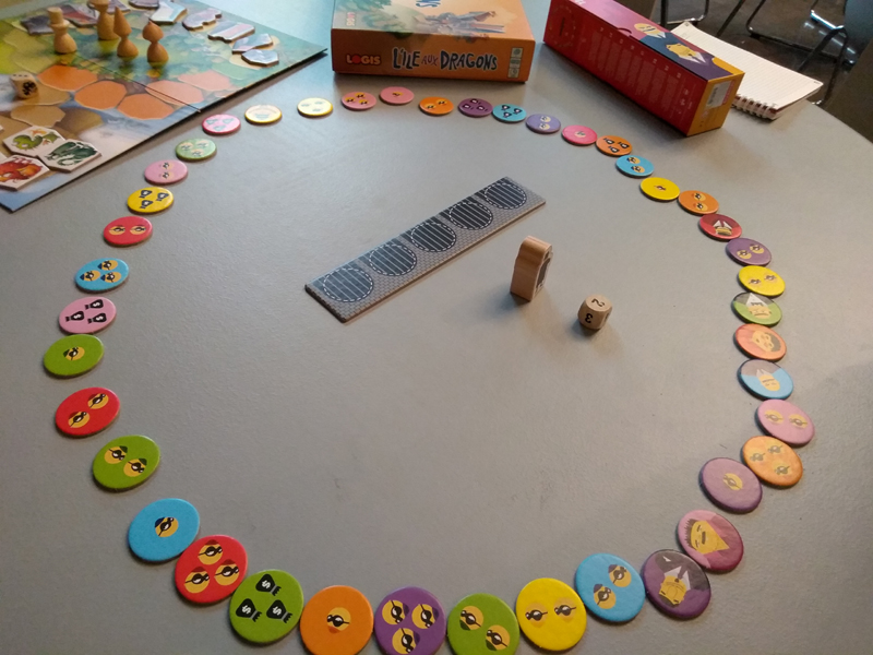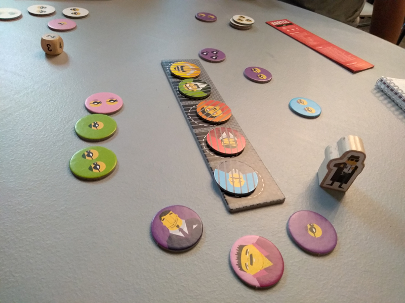 On dispose en cercle des jetons de couleur sur lesquels figurent les caïds à la mine patibulaire, leurs sbires façon rapetout ou des bourses. Chaque joueur à son tour lancera le dé, déplacera le policier (en mode Patchwork) d’un nombre de jetons entre 1 et la valeur obtenue et en prenant celui sur lequel il arrivera. Il y a donc un choix à faire sauf quand on fait 1.