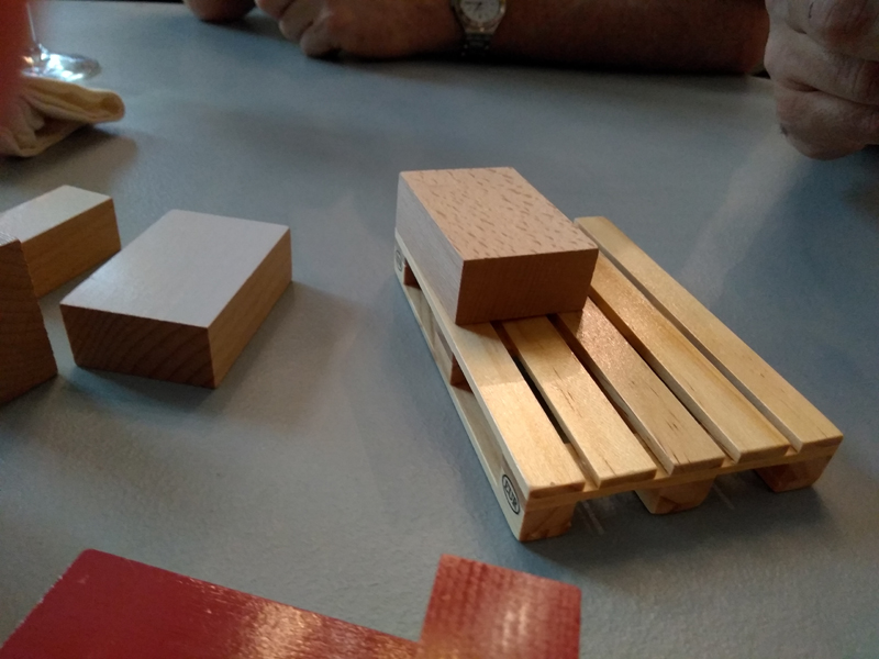 Team up ! est un jeu coopératif dans lequel les joueurs vont ranger des pièces en bois bleues et rouges de formes et de tailles différentes sur une petite palette de manière à constituer des étages complets (sans trou). Pour s’aider, on peut imaginer les Philiboys optimisant l’espace et empilant les précieux cartons de jeux dans le camion au retour d’Essen par exemple.