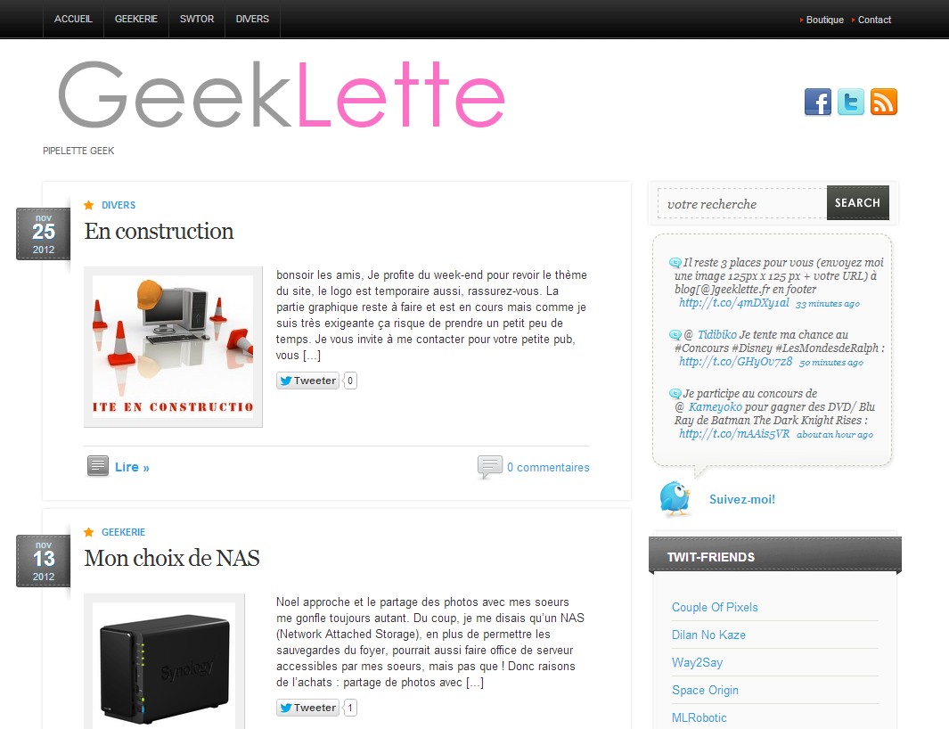 😀 Pour le tee-shirt j’aurais préféré voir Han Solo passer le R2-D2. Sinon, tu as fait pas mal de bon boulot toute seule ! Bravo ! Et tu sais, pour des questions de code, tu pourrais même en poser à nos devs à nous sur l’irc de SpaceOrigin. Ils sont assez sympas en général. J’aime bien le background twitter, tu aurais un petit Link de Skyward Sword à y rajouter ? 😉