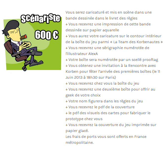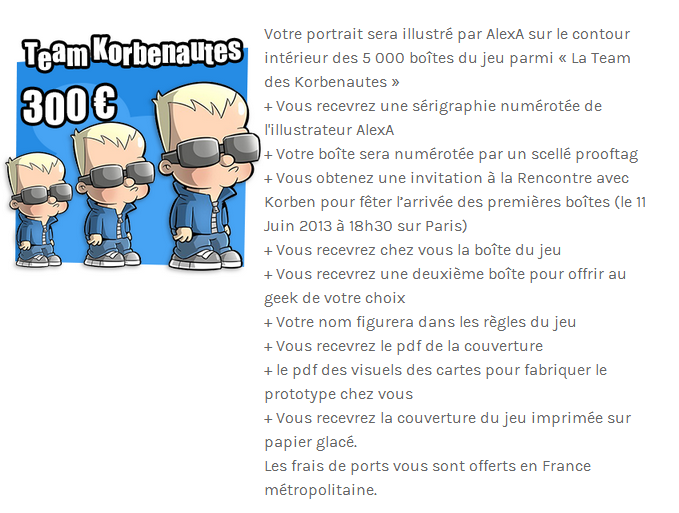 Son jeu a récolté tellement sur My Witty Games qu’ils ont failli fermer les participations avant la date prévue … Mais c’est bon j’ai pu y contribuer et il y a les copies d’écran de la bête en bas de l’article. Ma participation se résume à peu de choses mais eux se sont appliqués dans les images, les explications et les contreparties à chaque palier. En effet, pour 1 euros, vous n’avez pas grand chose mais pour 40 vous aurez la boite du jeu et au delà ça commence à être très intéressant.