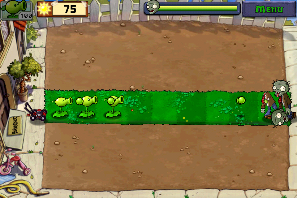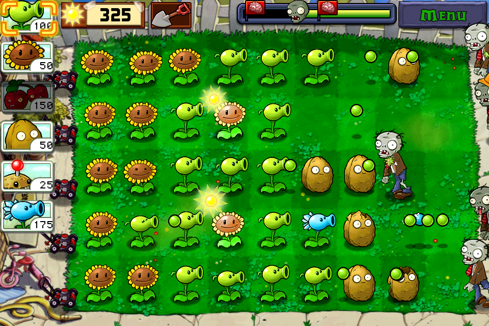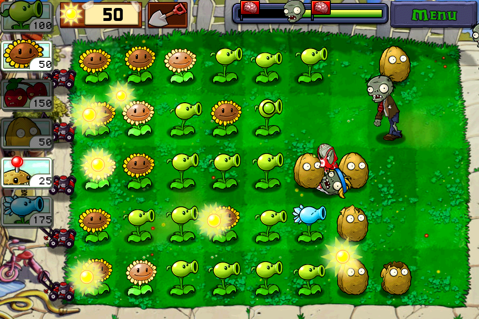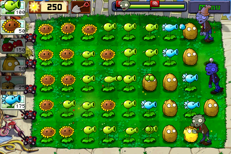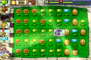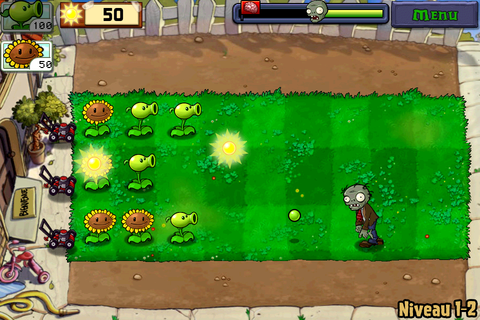 Présentons quand même ce jeu avant de vous prouver que sa version iOS est carrément réussie. Ce jeu se présente sous la forme d’un jardin quadrillé en plein milieu de l’écran. A gauche de ce jardin, votre maison (à protéger) et à droite les zombies. Le but étant de placer des plantes dans le quadrillage afin de ralentir et tuer les zombies qui essaye d’envahir la maison.