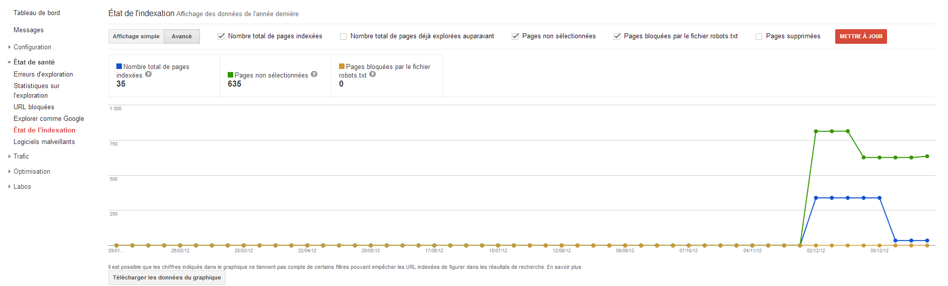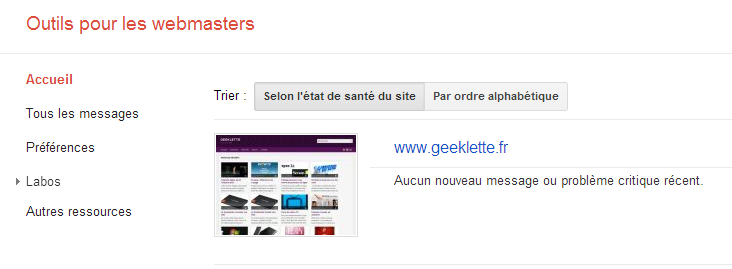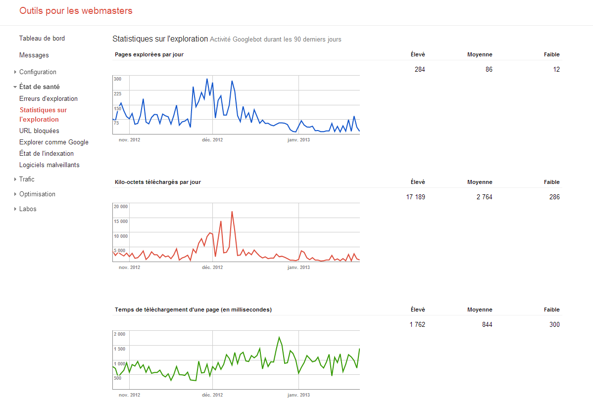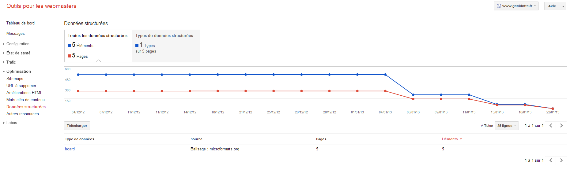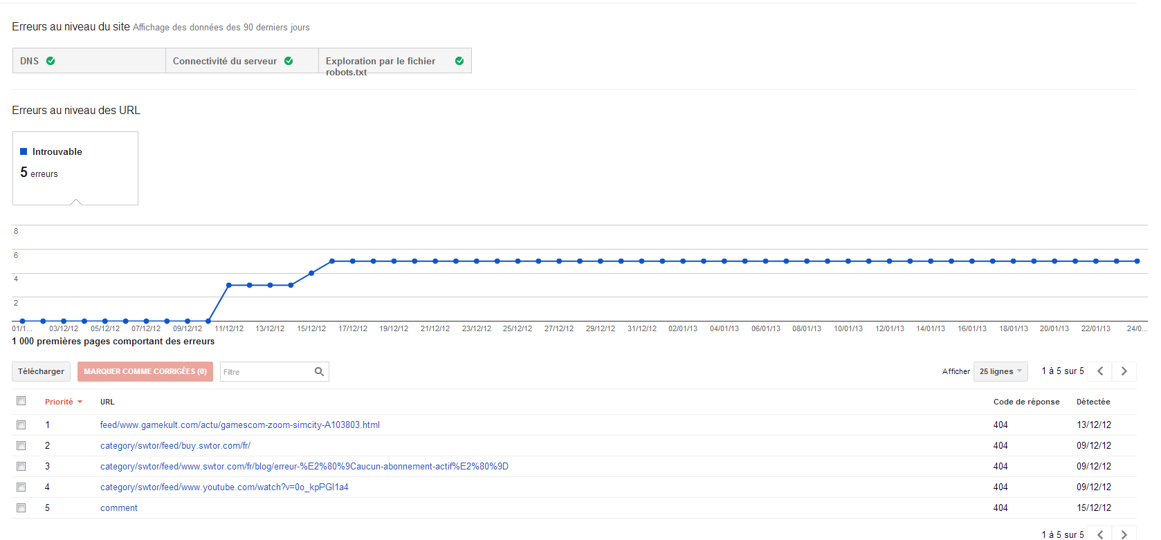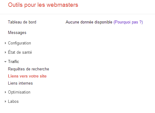 - D’après l‘outil d’aide pour webmaster de Google, le site ne comporte pas d’erreur monumentale mais 5 URL sont en erreur. Corrigeons les ! (chose faite, sauf une, pas trouvée)