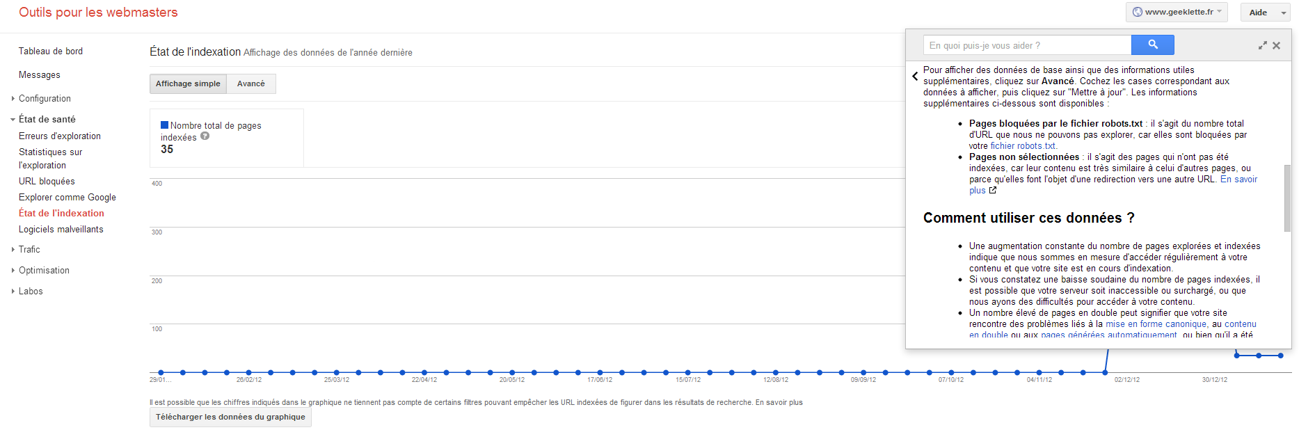 Ce que je comprends pas c’est que site:www.geeklette.fr affichait beaucoup de pages il y a quelques semaines, et là c’est la catastrophe.
