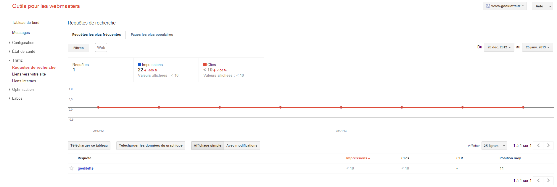 Pour savoir les pages référencées, j’ai tapé comme requete dans google « site:www.geekelette.fr » et paf : 2 résultats qui ne sont meme pas des pages….